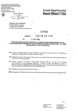 portant habilitation partielle à l'aide sociale départementale de l'établissement hébergeant des personnes âgées dépendantes "Le Parc des Salines II" sis à MULHOUSE Resumé Pièces jointes ARRETE Assemblée : Non défini Date : 12/08/2019 Rapporteur : Non défini Collectivité : Conseil départemental du Haut-Rhin Direction : Non défini Service : Direction Ressources Solidarité Domaine : Personnes Agées Commission :