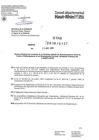 portant fixation du montant de la dotation globale de fonctionnement 2019 du centre d'hébergement et de réadaptation sociale "Solidarité Femmes 68" à SAINT LOUIS Resumé Pièces jointes ARRETE Assemblée : Non défini Date : 12/08/2019 Rapporteur : Non défini Collectivité : Conseil départemental du Haut-Rhin Direction : Non défini Service : Direction Ressources Solidarité Domaine : Dotations financières Commission :