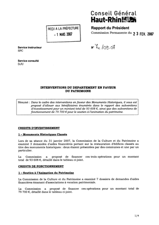 Dans le cadre des interventions en faveur des Monuments Historiques, il vous est proposé d’allouer aux bénéficiaires énumérés dans le rapport des subventions d’investissement pour un montant total de 93 608 €, ainsi que des subventions de fonctionnement de 79 700 € pour le soutien à l’animation du patrimoine.