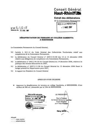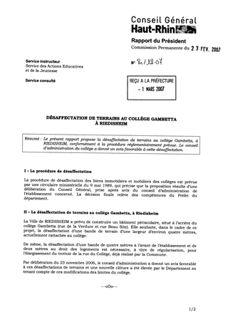 Le présent rapport propose la désaffectation de terrains au collège Gambetta, à RIEDISHEIM, conformément à la procédure réglementairement prévue. Le conseil d’administration du collège a donné un avis favorable à cette désaffectation.