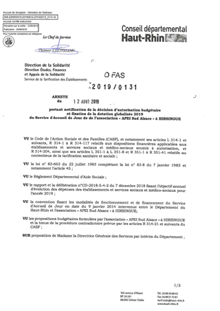 portant notification de la décision d'autorisation budgétaire et fixation de la dotation globalisée 2019 du service d'accueil de jour de l'association "APEI Sud Alsace" à HIRSINGUE Resumé Pièces jointes ARRETE Assemblée : Non défini Date : 12/08/2019 Rapporteur : Non défini Collectivité : Conseil départemental du Haut-Rhin Direction : Non défini Service : Direction Ressources Solidarité Domaine : Dotations financières Commission :