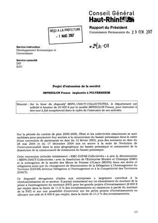Sur la base du dispositif MDPA /DIACT/COLLECTIVITES, le Département est sollicité à hauteur de 20 000 € par la société IMPREGLON France, pour intervenir à titre tout à fait exceptionnel dans le cadre de l’extension de ses activités.