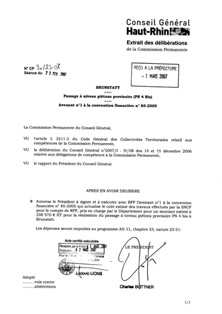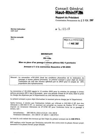 BRUNSTATT. PN 4 bis. Mise en place d'un passage à niveau piétons SAL 4 provisoire. Avenant n° 1 à la convention financière n° 85-2005.