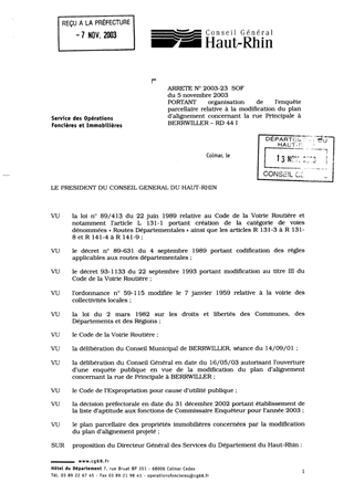 portant organisation de l'enquête parcellaire relative à la modification du plan d'alignement concernant la rue Principale à BERRWILLER - RD 44 I. Resumé Pièces jointes ARRETE Assemblée : Non défini Date : 05/11/2003 Rapporteur : Non défini Collectivité : Conseil départemental du Haut-Rhin Direction : Non défini Service : Service du Patrimoine et du droit des Sols Domaine : Autres (non classés) Commission :