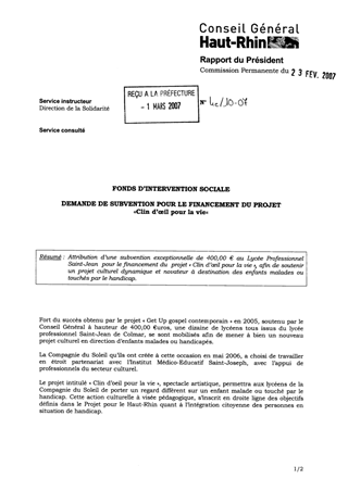 Attribution d’une subvention exceptionnelle de 400,00 € au Lycée Professionnel Saint-Jean pour le financement du projet « Clin d’œil pour la vie ». afin de soutenir un projet culturel dynamique et novateur à destination des enfants malades ou touchés par le handicap.
