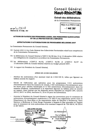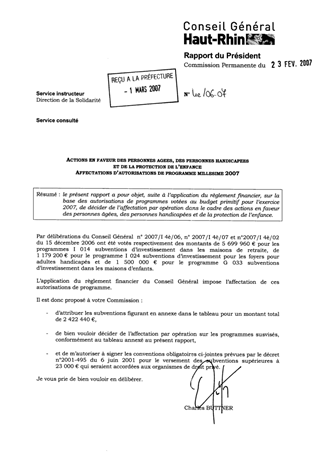 le présent rapport a pour objet, suite à l’application du règlement financier, sur la base des autorisations de programmes votées au budget primitif pour l’exercice 2007, de décider de l’affectation par opération dans le cadre des actions en faveur des personnes âgées, des personnes handicapées et de la protection de l’enfance.