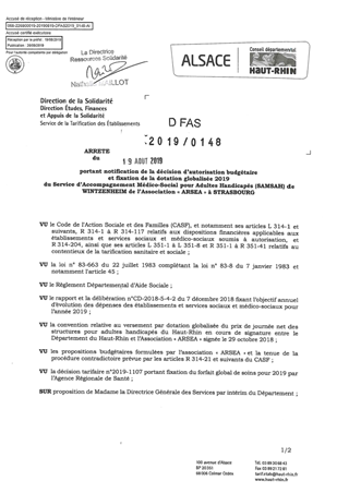 portant notification de la décision d'autorisation budgétaire et fixation de la dotation globalisée 2019 du service d'accompagnement médico-social pour adultes handicapés (SAMSAH) de WINTZENHEIM de l'association "ARSEA" à STRASBOURG Resumé Pièces jointes ARRETE Assemblée : Non défini Date : 19/08/2019 Rapporteur : Non défini Collectivité : Conseil départemental du Haut-Rhin Direction : Non défini Service : Direction Ressources Solidarité Domaine : Dotations financières Commission :