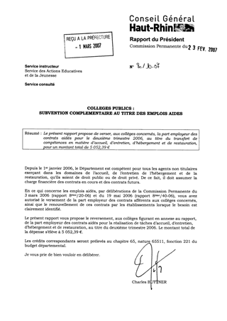 Le présent rapport propose de verser, aux collèges concernés, la part employeur des contrats aidés pour le deuxième trimestre 2006, au titre du transfert de compétences en matière d’accueil, d’entretien, d’hébergement et de restauration, pour un montant total de 5 052,39 €