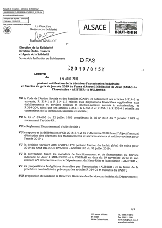 portant notification de la décision d'autorisation budgétaire et fixation du prix de journée 2019 du foyer d'accueil médicalisé de jour (FAMJ) de l'association "Alister" à MULHOUSE Resumé Pièces jointes ARRETE Assemblée : Non défini Date : 19/08/2019 Rapporteur : Non défini Collectivité : Conseil départemental du Haut-Rhin Direction : Non défini Service : Direction Ressources Solidarité Domaine : Prix de Journée Commission :