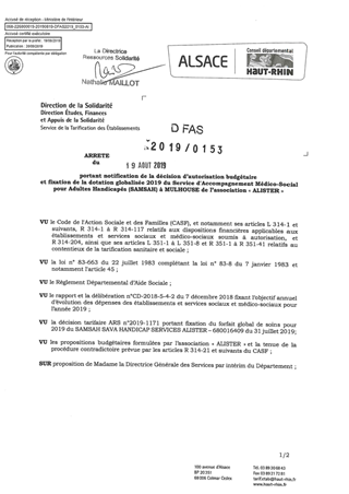 portant notification de la décision d'autorisation budgétaire et fixation de la dotation globalisée 2019 du service d'accompagnement médico-social pour adultes handicapés (SAMSAH) à MULHOUSE de l'association "Alister" Resumé Pièces jointes ARRETE Assemblée : Non défini Date : 19/08/2019 Rapporteur : Non défini Collectivité : Conseil départemental du Haut-Rhin Direction : Non défini Service : Direction Ressources Solidarité Domaine : Dotations financières Commission :