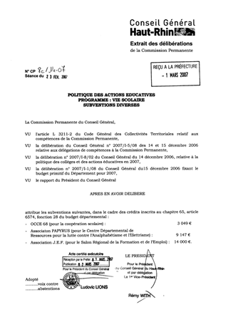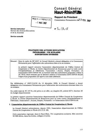 Dans le cadre du BP 2007, le Conseil Général a donné délégation à la Commission Permanente pour l’affectation des subventions liées à la vie scolaire. Le présent rapport concerne l’association départementale de l’Office Central de Coopération à l’Ecole, le Centre Départemental de Ressources pour la Lutte contre l’Analphabétisme et l’Illettrisme, l’association « Jeunes, Emploi, Formation » et l’association EDUC’ENVIA 68. Le montant total des subventions proposées s’élève à 26 196 €, étant entendu que la décision relative à l’association EDUC’ENVIA 68 fait l’objet d’une proposition de report à une date ultérieure.