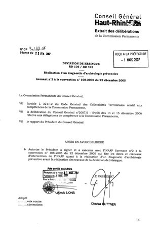 En application de la convention n° 108-2005, un avenant doit venir confirmer la date de début de la troisième phase de l’opération archéologique. Le présent avenant a pour objet de faire valider les dates de début et les délais de réalisation de l’opération archéologique préalable aux travaux de déviation de la RD 105 à Hésingue.