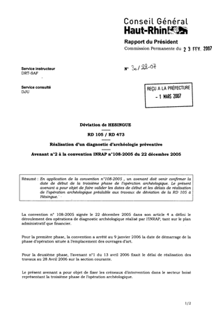 Déviation de HESINGUE. RD 105/ RD 473. Réalisation d'un diagnostic d'archéologie préventive. Avenant n°2 à la convention INRAP n° 108-2005 du 22 décembre 2005.
