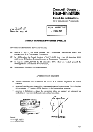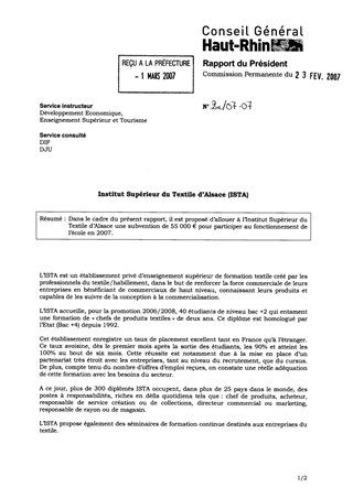 Dans le cadre du présent rapport, il est proposé d’allouer à l’Institut Supérieur du Textile d’Alsace une subvention de 55 000 € pour participer au fonctionnement de l’école en 2007.