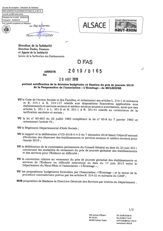 portant notification de la décision d'autorisation budgétaire et fixation du prix de journée 2019 de la pouponnière de l'association "L'Ermitage" de MULHOUSE Resumé Pièces jointes ARRETE Assemblée : Non défini Date : 26/08/2019 Rapporteur : Non défini Collectivité : Conseil départemental du Haut-Rhin Direction : Non défini Service : Direction Ressources Solidarité Domaine : Prix de Journée Commission :