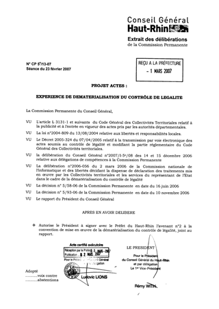 le présent rapport a pour objet de m’autoriser à signer avec le Préfet du Haut-Rhin l’avenant n°2 à la convention de mise en œuvre de la dématérialisation du contrôle de légalité.