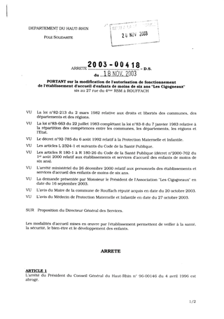 portant sur la modification de l'autorisation de fonctionnement de l'établissement d'accueil d'enfants de moins de six ans "Les Cigogneaux" sis au 27 rue du 4ème RSM à ROUFFACH. Resumé Pièces jointes ARRETE Assemblée : Non défini Date : 18/11/2003 Rapporteur : Non défini Collectivité : Conseil départemental du Haut-Rhin Direction : Non défini Service : Direction de la Solidarité Domaine : Accueil d'enfants Commission :