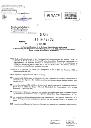 portant notification de la décision d'autorisation budgétaire et fixation du prix de journée 2019 du foyer d'accueil médicalisé de l'association "APF France Handicap" à MULHOUSE Resumé Pièces jointes ARRETE Assemblée : Non défini Date : 02/09/2019 Rapporteur : Non défini Collectivité : Conseil départemental du Haut-Rhin Direction : Non défini Service : Direction Ressources Solidarité Domaine : Prix de Journée Commission :