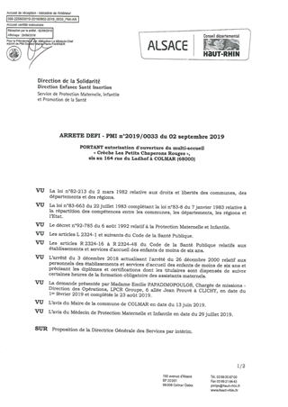portant autorisation d'ouverture du multi-accueil "Crèche Les Petits Chaperons Rouges", sis au 164 rue du Ladhof à COLMAR (68000) Resumé Pièces jointes ARRETE Assemblée : Non défini Date : 02/09/2019 Rapporteur : Non défini Collectivité : Conseil départemental du Haut-Rhin Direction : Non défini Service : Direction Enfance Famille Insertion Domaine : Accueil d'enfants Commission :
