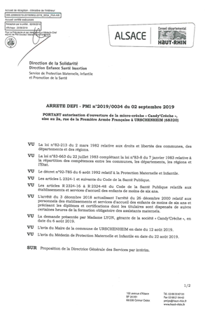 portant autorisation d'ouverture de la micro-crèche "Candy'Crèche", sise au 2a rue de la Première Armée Française à URSCHENHEIM (68320) Resumé Pièces jointes ARRETE Assemblée : Non défini Date : 02/09/2019 Rapporteur : Non défini Collectivité : Conseil départemental du Haut-Rhin Direction : Non défini Service : Direction Enfance Famille Insertion Domaine : Accueil d'enfants Commission :