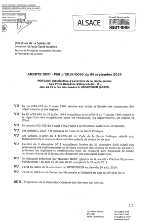 portant autorisation d'ouverture de la micro-crèche "Les P'tits Babadins d'Hégenheim - 2", sise au 30 a rue des Landes à HEGENHEIM (68220) Resumé Pièces jointes ARRETE Assemblée : Non défini Date : 04/09/2019 Rapporteur : Non défini Collectivité : Conseil départemental du Haut-Rhin Direction : Non défini Service : Direction Enfance Famille Insertion Domaine : Accueil d'enfants Commission :