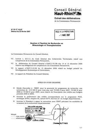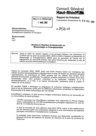 Dans le cadre du présent rapport, il est proposé d’allouer une subvention de 70 000 € par an pour les années 2007, 2008 et 2009 à l’Institut de Recherche en Hématologie et Transplantation (IRHT) pour la poursuite de l’étude sur la régénération du myocarde humain lésé après infarctus par réinjection in situ de cellules souches hématopoïétiques autologues.
