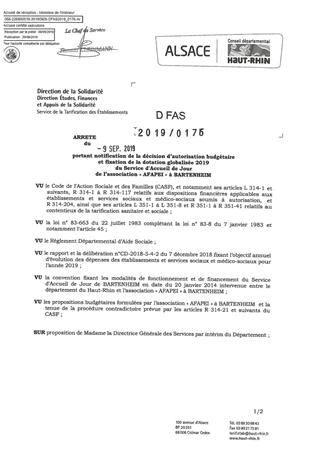 portant notification de la décision d'autorisation budgétaire et fixation de la dotation globalisée 2019 du service d'accueil de jour de l'association "AFAPEI" à BARTENHEIM Resumé Pièces jointes ARRETE Assemblée : Non défini Date : 09/09/2019 Rapporteur : Non défini Collectivité : Conseil départemental du Haut-Rhin Direction : Non défini Service : Direction Ressources Solidarité Domaine : Dotations financières Commission :
