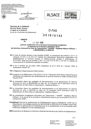 portant notification de la décision d'autorisation budgétaire et fixation de la dotation globalisée 2019 des services d'accueil de jour de l'association "ADAPEI - Papillons Blancs d'Alsace" à MULHOUSE et à SOULTZ Resumé Pièces jointes ARRETE Assemblée : Non défini Date : 11/09/2019 Rapporteur : Non défini Collectivité : Conseil départemental du Haut-Rhin Direction : Non défini Service : Direction Ressources Solidarité Domaine : Dotations financières Commission :