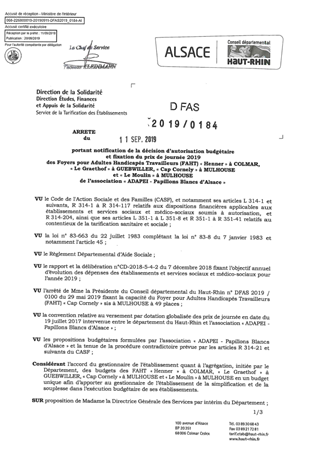 portant notification de la décision d'autorisation budgétaire et fixation du prix de journée 2019 des foyers pour adultes handicapés travailleurs (FAHT) "Henner" à COLMAR, "Le Graethof" à GUEBWILLER, "Cap Cornely" à MULHOUSE et "Le Moulin" à MULHOUSE de l