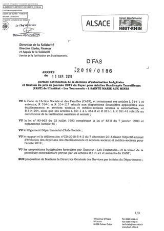 portant notification de la décision d'autorisation budgétaire et fixation du prix de journée 2019 du foyer pour adultes handicapés travailleurs (FAHT) de l'Institut "Les Tournesols" à SAINTE MARIE AUX MINES Resumé Pièces jointes ARRETE Assemblée : Non défini Date : 11/09/2019 Rapporteur : Non défini Collectivité : Conseil départemental du Haut-Rhin Direction : Non défini Service : Direction Ressources Solidarité Domaine : Prix de Journée Commission :