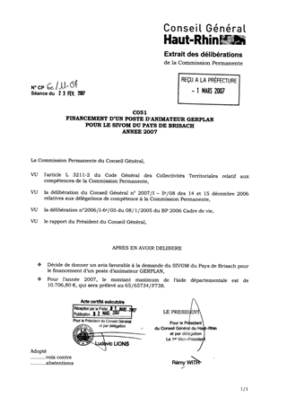 Il vous est proposé de donner un avis favorable pour le financement d’un poste d'animateur GERPLAN au SIVOM du Pays de Brisach, pour une durée de 6 ans. Le montant de notre subvention pour 2007 serait de 10 706,80 €.