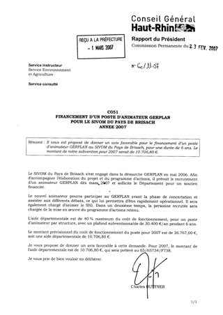 Financement d'un poste d'animateur GERPLAN pour le SIVOM du Pays de Brisach. Année 2007.