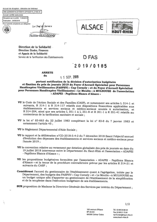 portant notification de la décision d'autorisation budgétaire et fixation du prix de journée 2019 du foyer d'accueil spécialisé pour personnes handicapées vieillissantes (FASPHV) "Cap Cornely" et du foyer d'accueil spécialisé pour personnes handicapées vi