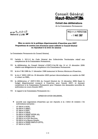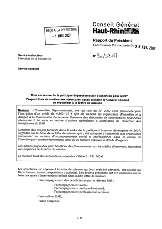 L’Assemblée Départementale, lors du vote du BP 2007 s’est prononcée pour l’inscription d’un crédit de 4 849 125 € afin de soutenir les organismes d’insertion et a délégué à la Commission Permanente l’examen des demandes de contributions financières nécessaire à la mise en œuvre d’actions spécifiques à destination de l’insertion des bénéficiaires du RMI. L'examen des projets formulés dans le cadre de la politique d’insertion développée en 2007, s’effectue sur la base de la lettre de mission qui a été adressée à l’ensemble des organismes intervenant en matière d’accompagnement social et professionnel, dans le champ de l’insertion par l’activité économique, ainsi qu’en matière d’accueil et d’aide d’urgence. Les actions proposées pour bénéficier des financements sur les crédits d’insertion, répondent aux exigences de la lettre de mission. Le montant total des subventions proposées s’élève à : 731 700 €.