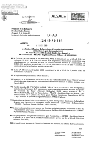portant notification de la décision d'autorisation budgétaire et fixation du prix de journée 2019 du foyer d'accueil médicalisé (FAM) "Cap Cornely" de l'association "ADAPEI - Papillons Blancs d'Alsace" à MULHOUSE Resumé Pièces jointes ARRETE Assemblée : Non défini Date : 11/09/2019 Rapporteur : Non défini Collectivité : Conseil départemental du Haut-Rhin Direction : Non défini Service : Direction Ressources Solidarité Domaine : Prix de Journée Commission :