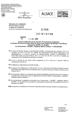 portant notification de la décision d'autorisation budgétaire et fixation du prix de journée 2019 du foyer pour adultes handicapés travailleurs autonomes (FAHT) "Le Moulin" de l'association "ADAPEI - Papillons Blancs d'Alsace" à MULHOUSE Resumé Pièces jointes ARRETE Assemblée : Non défini Date : 11/09/2019 Rapporteur : Non défini Collectivité : Conseil départemental du Haut-Rhin Direction : Non défini Service : Direction Ressources Solidarité Domaine : Prix de Journée Commission :