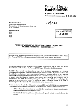 Il est proposé d’attribuer une aide de 16 500 € au Parc Naturel Régional des Ballons des Vosges (PNRBV) pour l’organisation de l’édition 2007 de la Navette des Crêtes.