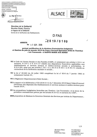 portant notification de la décision d'autorisation budgétaire et fixation du prix de journée 2019 du foyer d'accueil spécialisé (FAS) de l'Institut "Les Tournesols" à SAINTE MARIE AUX MINES Resumé Pièces jointes ARRETE Assemblée : Non défini Date : 11/09/2019 Rapporteur : Non défini Collectivité : Conseil départemental du Haut-Rhin Direction : Non défini Service : Direction Ressources Solidarité Domaine : Prix de Journée Commission :