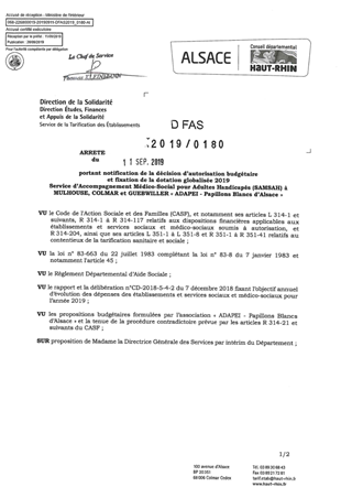 portant notification de la décision d'autorisation budgétaire et fixation de la dotation globalisée 2019 du service d'accompagnement médico-social pour adultes handicapés (SAMSAH) à MULHOUSE, COLMAR et GUEBWILLER "ADAPEI - Papillons Blancs d'Alsace Resumé Pièces jointes ARRETE Assemblée : Non défini Date : 11/09/2019 Rapporteur : Non défini Collectivité : Conseil départemental du Haut-Rhin Direction : Non défini Service : Direction Ressources Solidarité Domaine : Dotations financières Commission :
