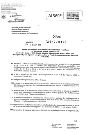 portant notification de la décision d'autorisation budgétaire et fixation du prix de journée 2019 du service Louis et Zélie Martin d'action éducative en milieu ouvert avec hébergement périodique ou exceptionnel de la fondation des apprentis d'Auteuil à CO