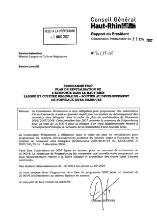 La Commission Permanente a reçu délégation pour programmer des subventions d’investissements scolaires (premier degré) pour un soutien au développement des nouveaux sites bilingues dans le cadre du plan de revitalisation de l’économie 2006/2007/2008. Cette première liste 2007 concerne la commune de Folgensbourg pour un total de 30 000 € pour la création d’un local supplémentaire réservé à l’enseignement bilingue à l’occasion de la construction d’une nouvelle école.
