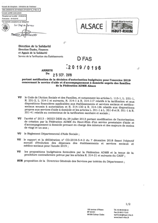 portant notification de la décision d'autorisation budgétaire pour l'exercice 2019 concernant le service d'aide et d'accompagnement à domicile auprès des familles de la fédération ADMR Alsace Resumé Pièces jointes ARRETE Assemblée : Non défini Date : 25/09/2019 Rapporteur : Non défini Collectivité : Conseil départemental du Haut-Rhin Direction : Non défini Service : Direction Ressources Solidarité Domaine : Dotations financières Commission :