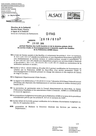 portant fixation des tarifs horaires et de la dotation globale 2019 du service d'aide et d'accompagnement à domicile auprès des familles de la fédération ADMR Alsace Resumé Pièces jointes ARRETE Assemblée : Non défini Date : 25/09/2019 Rapporteur : Non défini Collectivité : Conseil départemental du Haut-Rhin Direction : Non défini Service : Direction Ressources Solidarité Domaine : Dotations financières Commission :