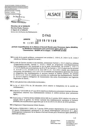 portant requalification de la maison d'accueil rurale pour personnes âgées (MARPA) en résidence autonomie pour personnes âgées gérée par l'Association "MARPA de la Largue" à SEPPOIS LE BAS Resumé Pièces jointes ARRETE Assemblée : Non défini Date : 11/10/2019 Rapporteur : Non défini Collectivité : Conseil départemental du Haut-Rhin Direction : Non défini Service : Direction Ressources Solidarité Domaine : Personnes Agées Commission :