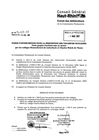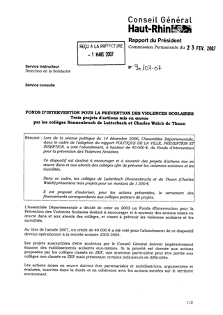 Lors de la séance publique du 14 décembre 2006, l'Assemblée Départementale, dans le cadre de l'adoption du rapport POLITIQUE DE LA VILLE, PREVENTION ET INSERTION, a voté l'abondement, à hauteur de 40 000 €, du Fonds d'Intervention pour la prévention des Violences Scolaires. Ce dispositif est destiné à encourager et à soutenir des projets d'actions mis en œuvre dans et aux abords des collèges afin de prévenir les violences scolaires et les incivilités. Dans ce cadre, les collèges de Lutterbach (Nonnenbruch) et de Thann (Charles Walch) présentent trois projets pour un montant de 1 300 €. Il est proposé d'autoriser, pour les actions présentées, le versement des financements correspondants aux collèges porteurs de projets.