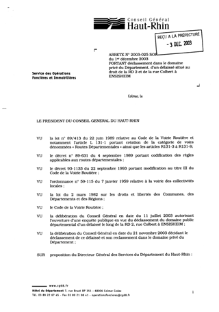 portant déclassement dans le domaine privé du département d'un délaissé situé au droit de la RD 2 et de la rue Colbert à ENSISHEIM. Resumé Pièces jointes ARRETE Assemblée : Non défini Date : 01/12/2003 Rapporteur : Non défini Collectivité : Conseil départemental du Haut-Rhin Direction : Non défini Service : Service du Patrimoine et du droit des Sols Domaine : Déclassement de voirie Commission :
