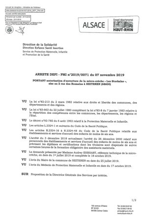 portant autorisation d'ouverture de la micro-crèche "Les Storkalas", sise au 2 rue des Romains à HEITEREN (68600) Resumé Pièces jointes ARRETE Assemblée : Non défini Date : 07/11/2019 Rapporteur : Non défini Collectivité : Conseil départemental du Haut-Rhin Direction : Non défini Service : Direction Enfance Famille Insertion Domaine : Accueil d'enfants Commission :