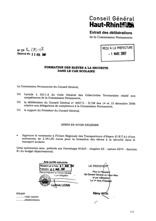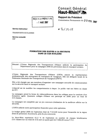 L’Union Régionale des Transporteurs d’Alsace sollicite la participation du Département pour la campagne 2006 de prévention dans le transport scolaire.