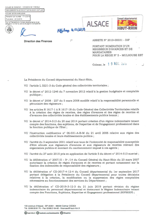 portant nomination d'un régisseur d'avances et de mandataires pour la régie n° 5 - MULHOUSE Est Resumé Pièces jointes ARRETE Assemblée : Non défini Date : 19/11/2019 Rapporteur : Non défini Collectivité : Conseil départemental du Haut-Rhin Direction : Non défini Service : Direction des Finances Domaine : Autres (non classés) Commission :