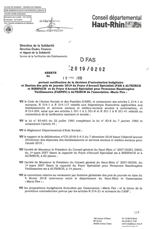 portant notification de la décision d'autorisation budgétaire et fixation des prix de journée 2019 du foyer d'accueil spécialisé (FAS) à ALTKIRCH et RIESPACH et du foyer d'accueil spécialisé pour personnes handicapées vieillissantes (FASPHV) à ALTKIRCH